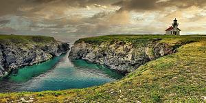 Perched on the rugged bluffs of Northern California’s Mendocino coast, the Point Cabrillo Lighthouse stands as a timeless sentinel overlooking the Pacific. The emerald inlet below carves its way through rocky cliffs, mirroring the restless energy of the ocean beyond. Bathed in golden light beneath a moody sky, the scene evokes both solitude and strength—a quiet reminder of the lighthouse’s historic role in guiding mariners through treacherous waters. This image captures the serene beauty and enduring spirit of California’s wild coastline, where land, sea, and sky meet in breathtaking harmony.