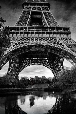 This dramatic black-and-white photograph captures the Eiffel Tower from a low vantage point, emphasizing the intricate latticework of its iron architecture. The image is mirrored in a calm pond below, creating a powerful sense of symmetry and stillness. Framed by trees and shrouded in moody contrast, the photo evokes both the grandeur and solitude of Paris's most iconic landmark. A timeless tribute to engineering and artistry, suspended between sky and reflection.